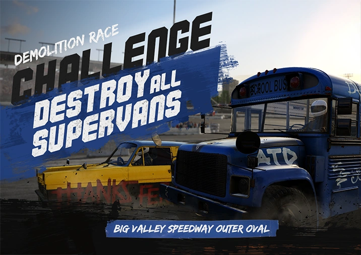 It's chaos, mayhem and destruction, as the most reckless demolition racing drivers spread terror and evil on a variety of Oval and Figure 8 tracks for the ultimate smash-fest of the season.